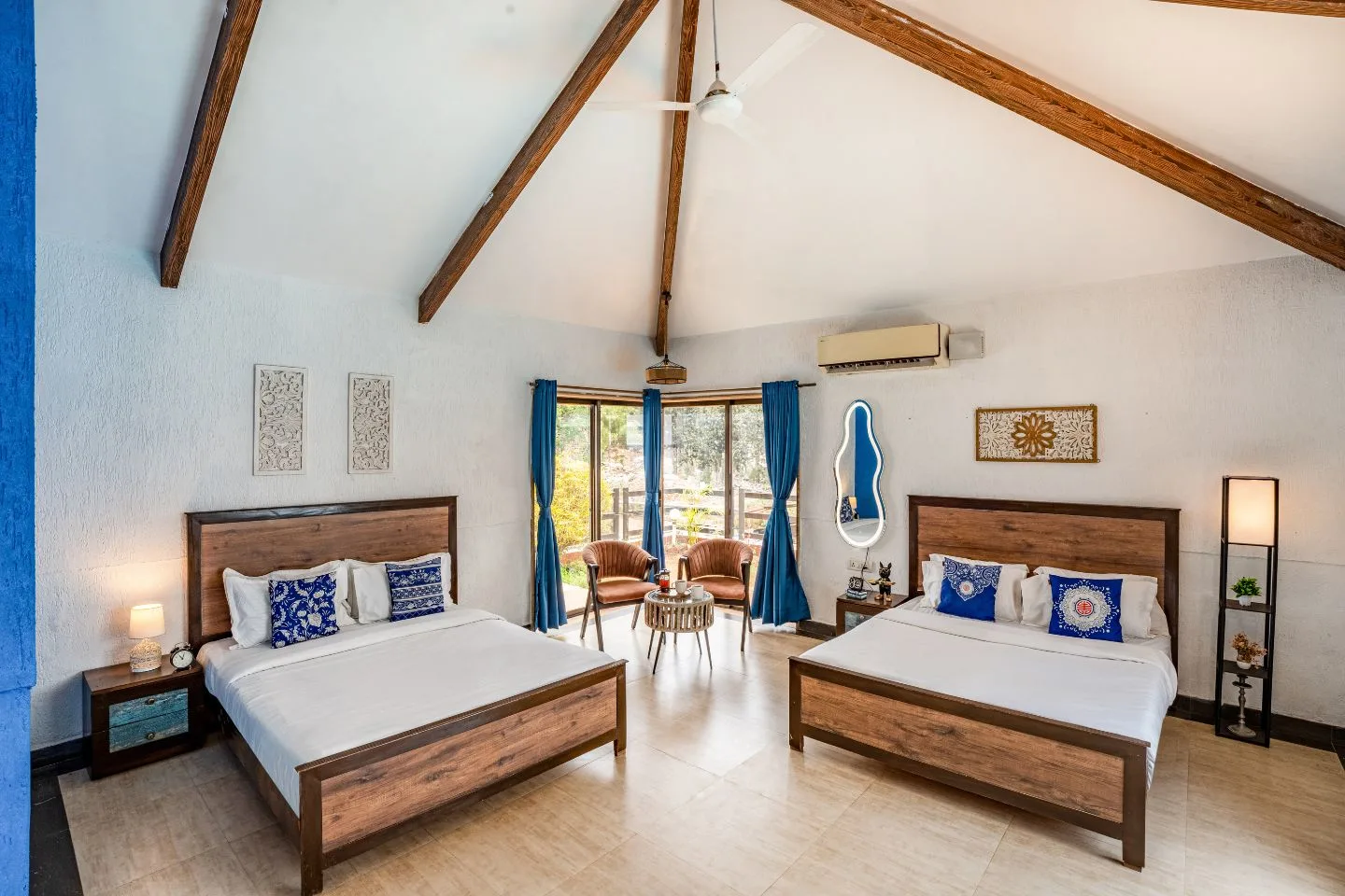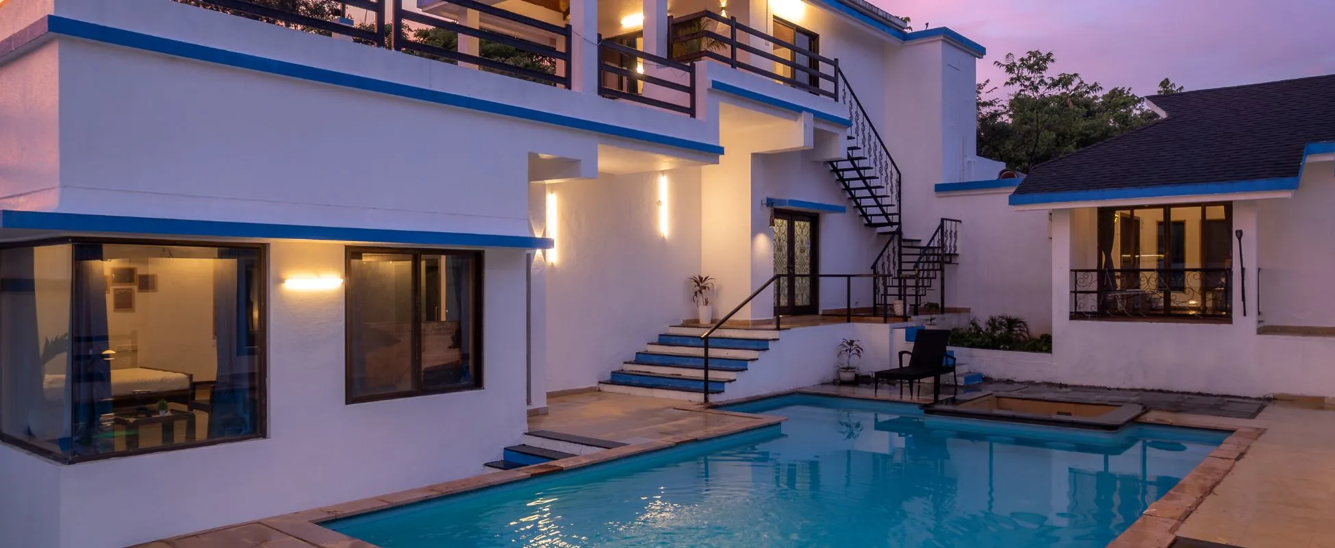 This luxurious 5 BHK villa, located in the picturesque hills of Lonavla, takes inspiration from the beautiful island of Santorini. With its spacious 22,000 sq. ft., pristine white-and-blue aesthetic, and breathtaking views of the mountains, this villa truly embodies luxury and relaxation. Enjoy a dip in the private swimming pool, unwind in one of the two elegant bathtubs, and indulge in gourmet meals prepared by your own personal chef. And for those looking for some friendly competition, this villa offers an expansive cricket turf and an exclusive private paddle court – making it the only villa in India to offer such extraordinary amenities.